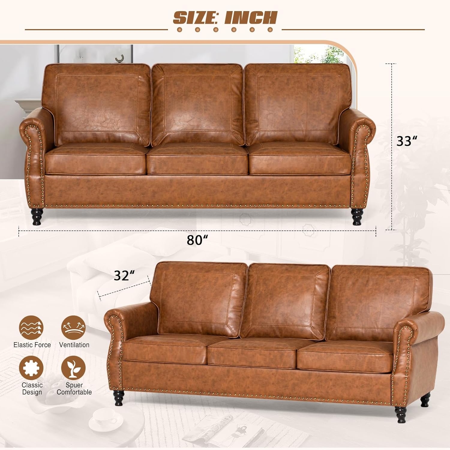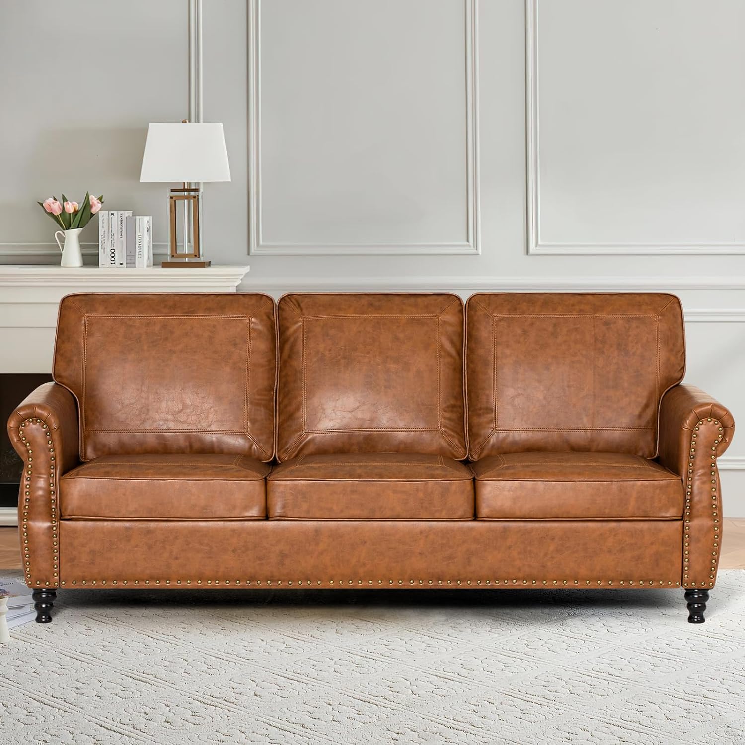 - BEAUTIFUL NAILHEAD TRIM DESIGN: The beautiful nailhead trim design is the finishing touch of this three seater sofa. The scrolled armrests make the whole leather couch more delicate. This modern sofa can add a retro looking to your home