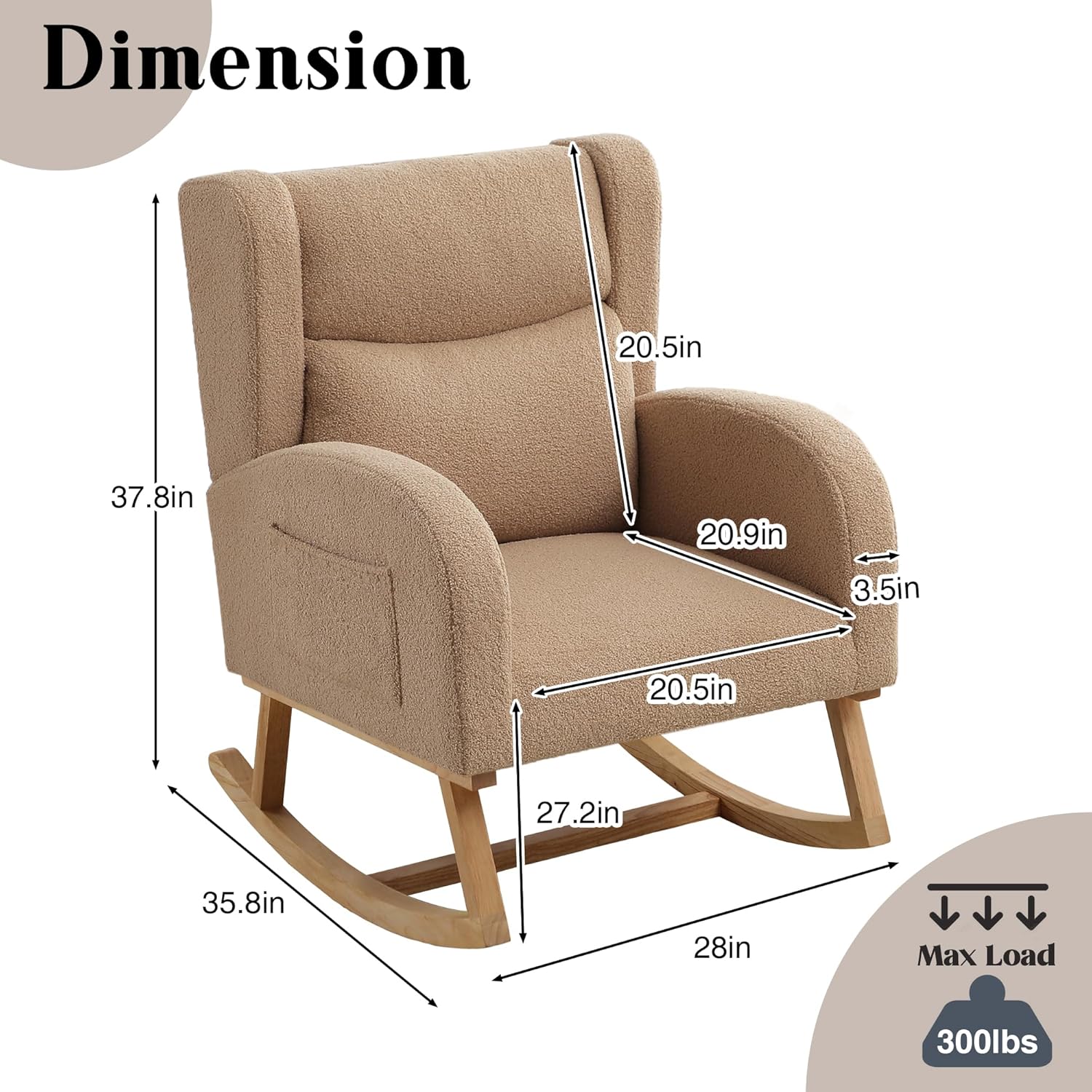• 【Perfect Size】 Nursery chair with an overall dimension of 27.95″W x 35.82″D x 37.7″H and a seat dimension of 20.47″W x 20.86″D x 20.47″H. This rocking chair is suitable for versatile design, making it an excellent choice for any home, office or nursery.