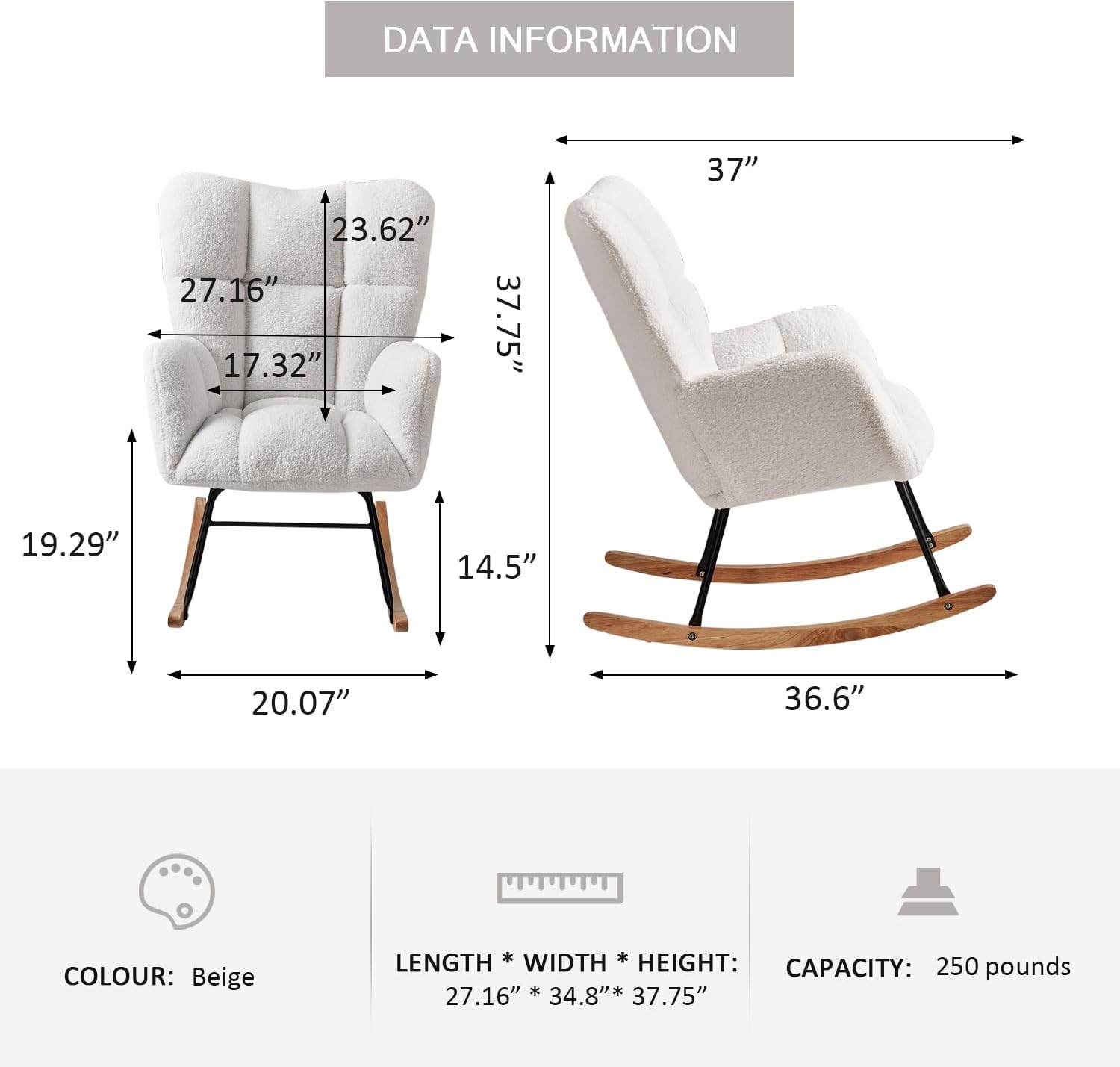 - Sturdy & Durable Frame: The rocking lounge chair is made of metal and solid wood, which ensures great stability and a high load capacity of 250 lbs. Curved leg pads on the legs protect your floor from scratches.
