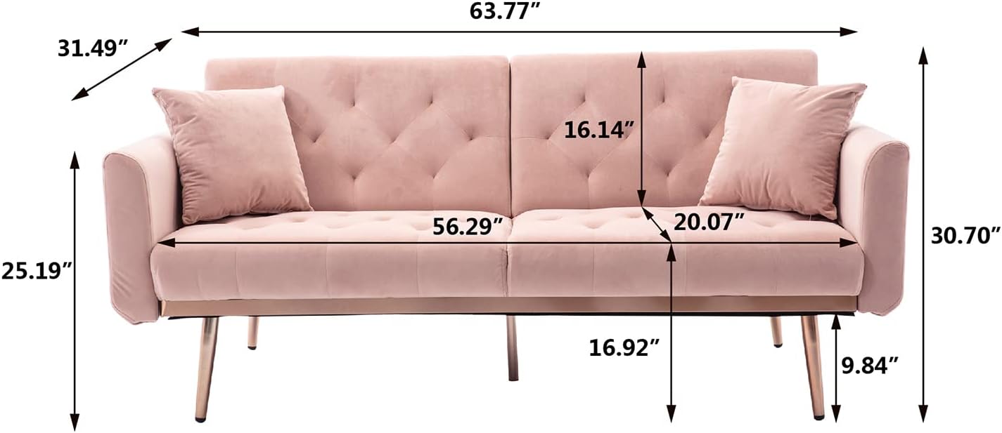 - ►【Stylish & Chic Design】The velvet surface and the rose golden metal legs make this convertible sofa look elegant and stylish. The surface of the backrest and seat cushion adopts a diamond cutting design, making the sofa more chic. Two soft pillows can make the sofa more distinctive.